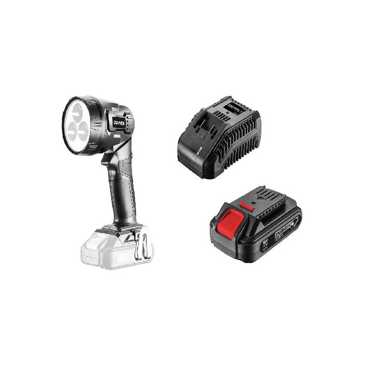 SKU: 1116118V Li-Ion LED baterijska lampa Temperatura boje 7000 K Količina svetlosti 260 lm Svetlosni ugao 120° Vreme punjena 1h Pokazivač stanja baterije na bateriji Ergonomska drška Obložen gumom Težina 0,3Kg Isporučuje se bez baterije Kompatbilna sa Energy + baterijama
