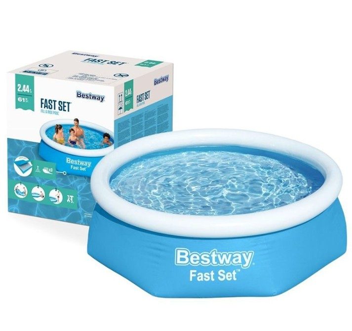 Bazen za decu sa prstenom na naduvavanje 244x61cm Bestway 57450 je bazen za brzo i jednostavno sklapanje – izaberite ravnu površinu, naduvajte prsten na naduvavanje, napunite bazen vodom i bazen je spreman za uživnaje! Ekstra jaki bočni zidovi bazena za decu sa prstenom su izgrađeni od Tritech™ , troslojnog ojačanog materijala sa jezgrom od poliesterske mreže između dva sloja čvrstog PVC materijala. Ovo zajedno čini debljinu od 0,40-0,80 mm u zavisnosti od veličine bazena, što obezbeđuje vrhunsku snagu i izdržljivost. Sa svojim prstenom na naduvavanje, bazen Fast Set linije Bestway 57450 je veoma lako instalirati u vašoj bašti za dugotrajno uživanje i rashlađivanje dece, a i odraslih.