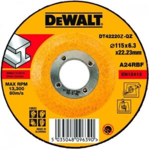 Dewalt DT42620 brusna ploča za metal 230mm x 6.3mm x 22.23mm Za opšte primene za brušenje metala na crnim i obojenim metalima, uključujući pripremu zavara i površine A24RBF materijal Vrhunska veza smole Ojačana staklena vlakna