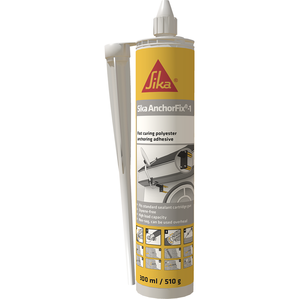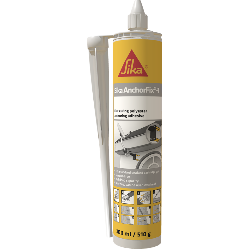 Sika AnchorFix® – 1 Dvokomponentna masa za ankerisanje na bazi metakrilata bez sadržaja razređivača i stirena. Zatvori detalje Upotreba Kao brzovezujuća masa ( lepak) za ankerisanje za sve vrste betonskog gvožđa/armaturnog čelika, šipki sa navojima,zavrtnja i specijalnih sistema za učvršćivanje. Na sledećim podlogama: beton, prirodan tvrdi kamen, čvrsta stena, šuplja i puna opeka.