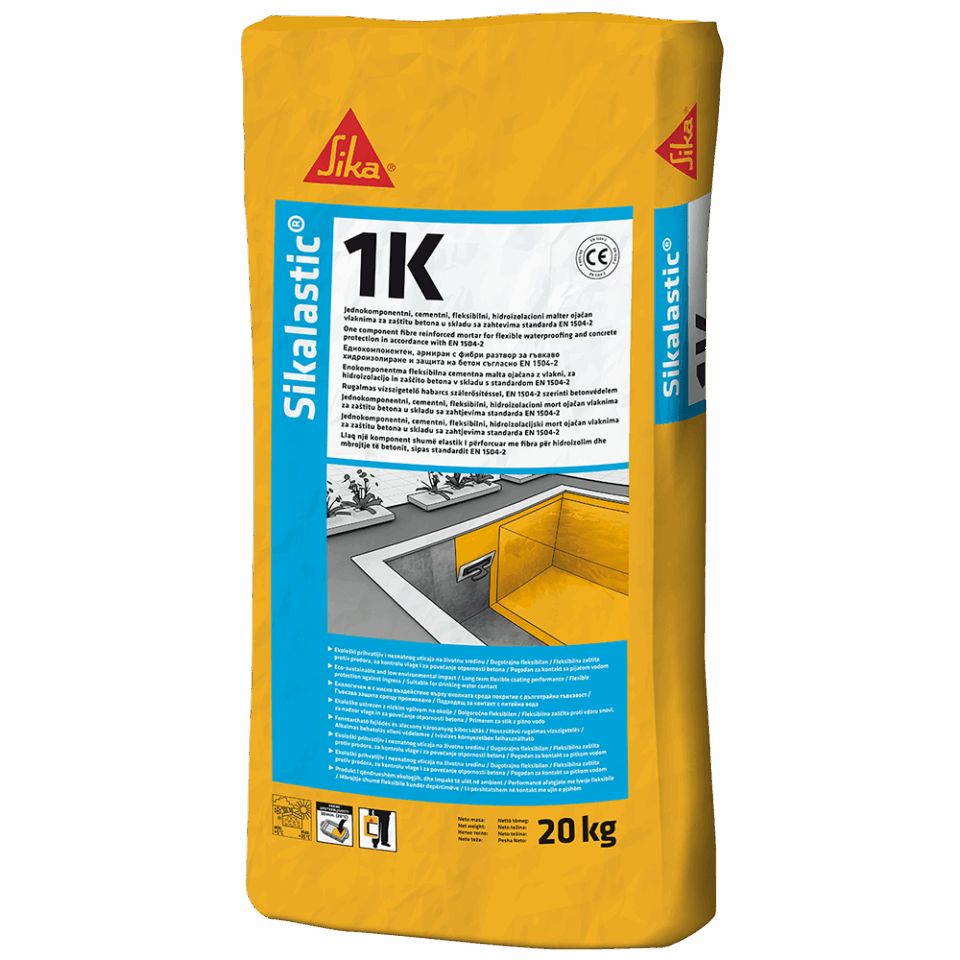 SikaLastic®-1K je jednokomponentni, fleksibilni malter, ojačan vlaknima na bazi modifikovanog cementa, sa dodatkom specijalnih modifikovanih polimera otpornih na alkalije. Sadrži posebno selektirane agregate sitne granulacije i odgovarajuće aditive za vodonepropusnost betonskih podloga izloženih naponima zatezanja. Sikalastic®-1K je moguće je nanositi gleterom, četkom ili valjkom.