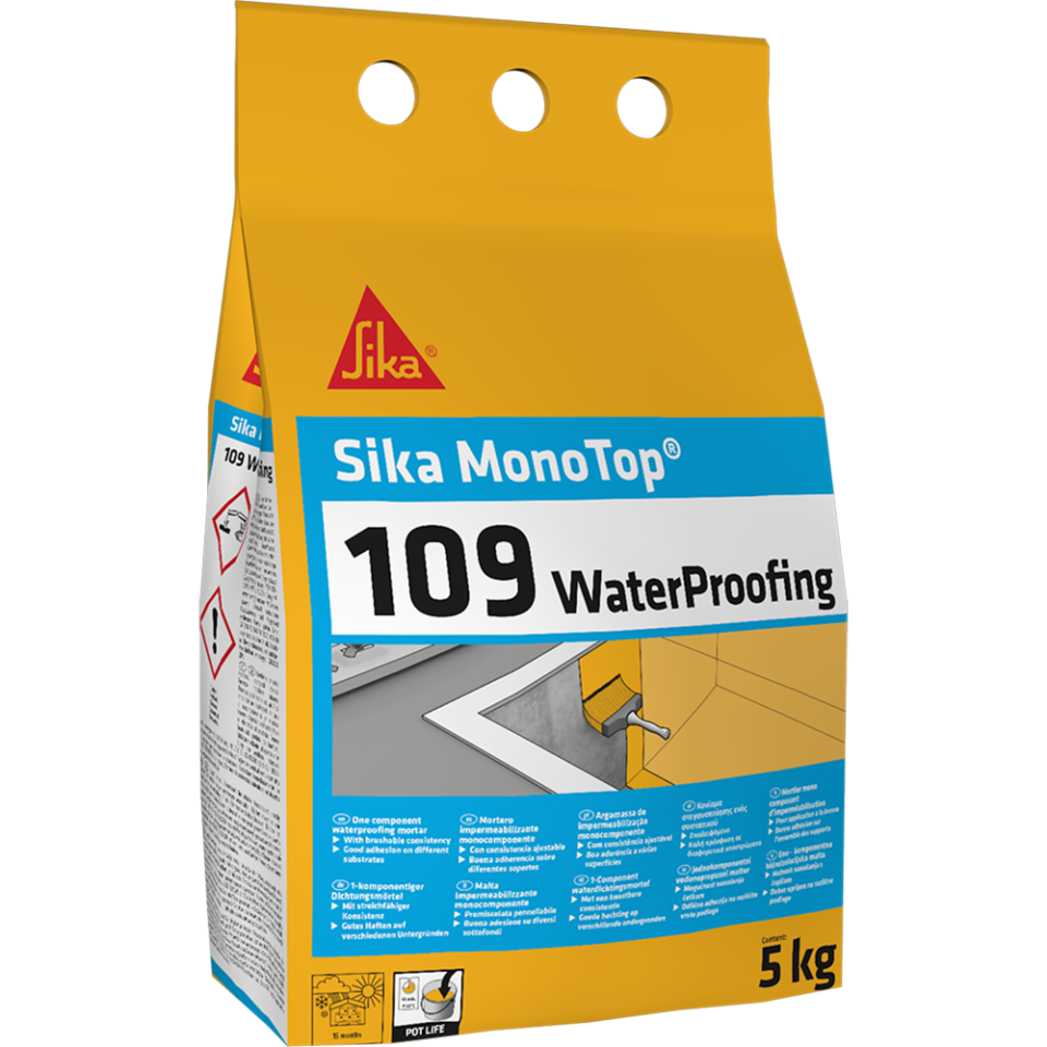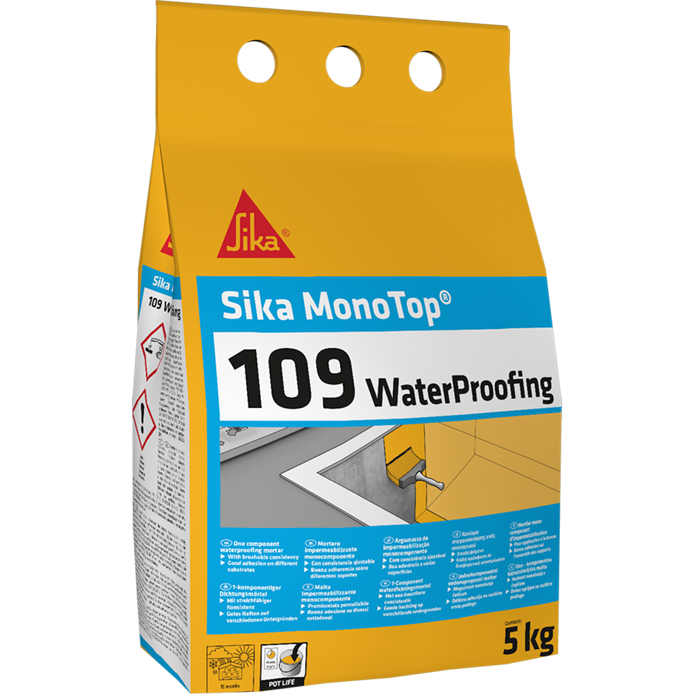 Sika MonoTop 109 WaterProofing je jednokomponentni hidroizolacioni malter koji je spreman za upotrebu. Upotreba Sika® MiniPack Waterproofing Mortar je posebno predviđen za hidroizolaciju i zaštitu temelja, podzemnih ili delimično ukopanih zidova itd. Može da se nanosi na beton, građevinske blokove i cementni malter itd.