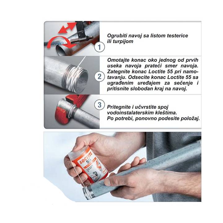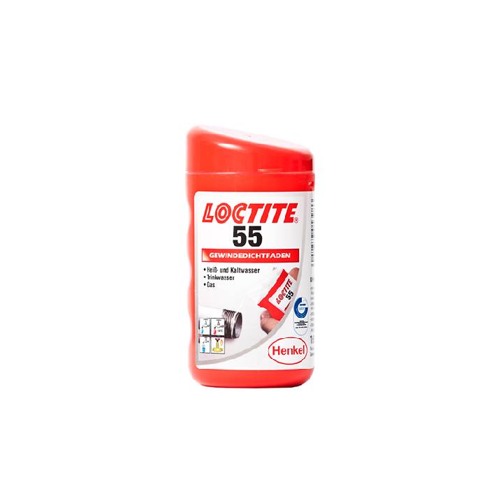 Konac za zaptivanje cevnih navoja – trenutno zaptivanje pod punim pritiskom. Dozvoljava podešavanje nakon montaže.LOCTITE® 55 služi za osiguranje i zaptivanje metalnih i plastičnih cevi i navoja. Nije mu potrebno vreme za očvršćavanje i rezultuje trenutnim zaptivanjem pod punim pritiskom. To je pravi izbor za brzo, jednostavno i pouzdano zaptivanje. Proizvod ima atest za korišćenje u sistemima sa gasom i pijaćom vodom i sertifikovan je od strane NSF/ANSI, Standard 61.Karakteristike: